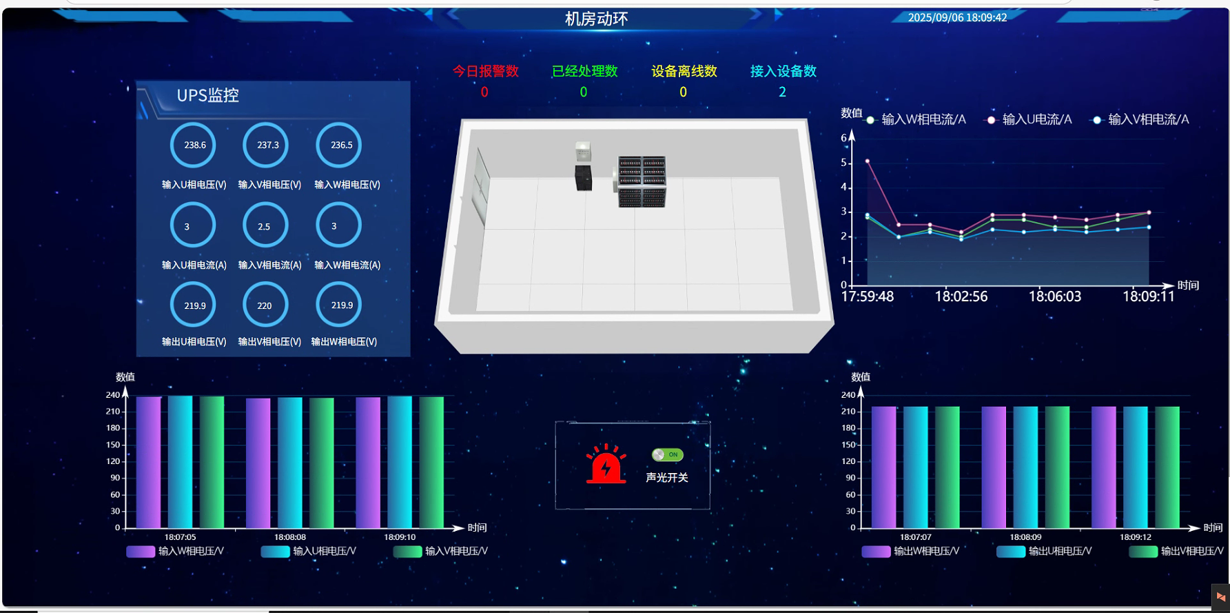 UPS監控: 2臺UPS的輸入/輸出參數、負載、狀態及告警信息。