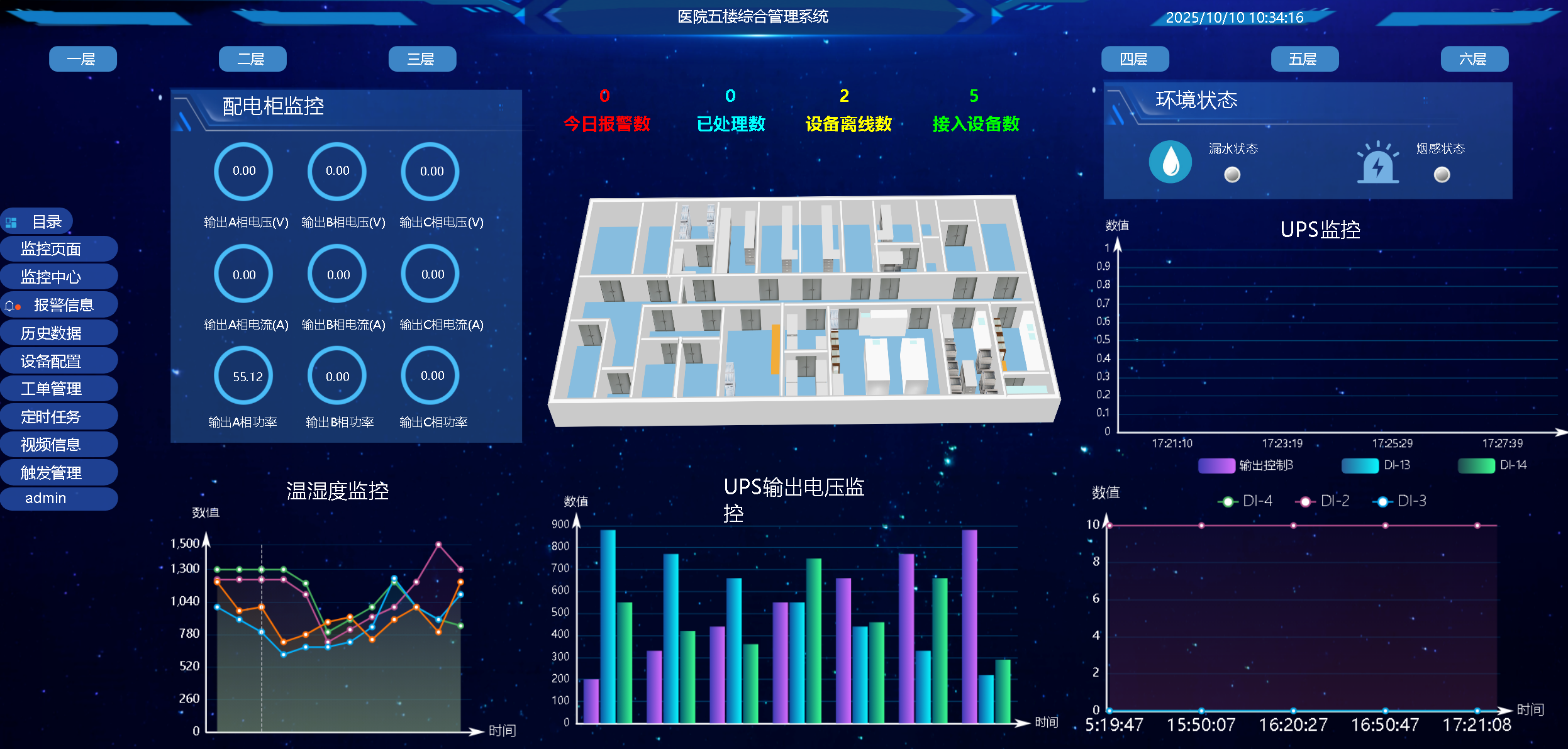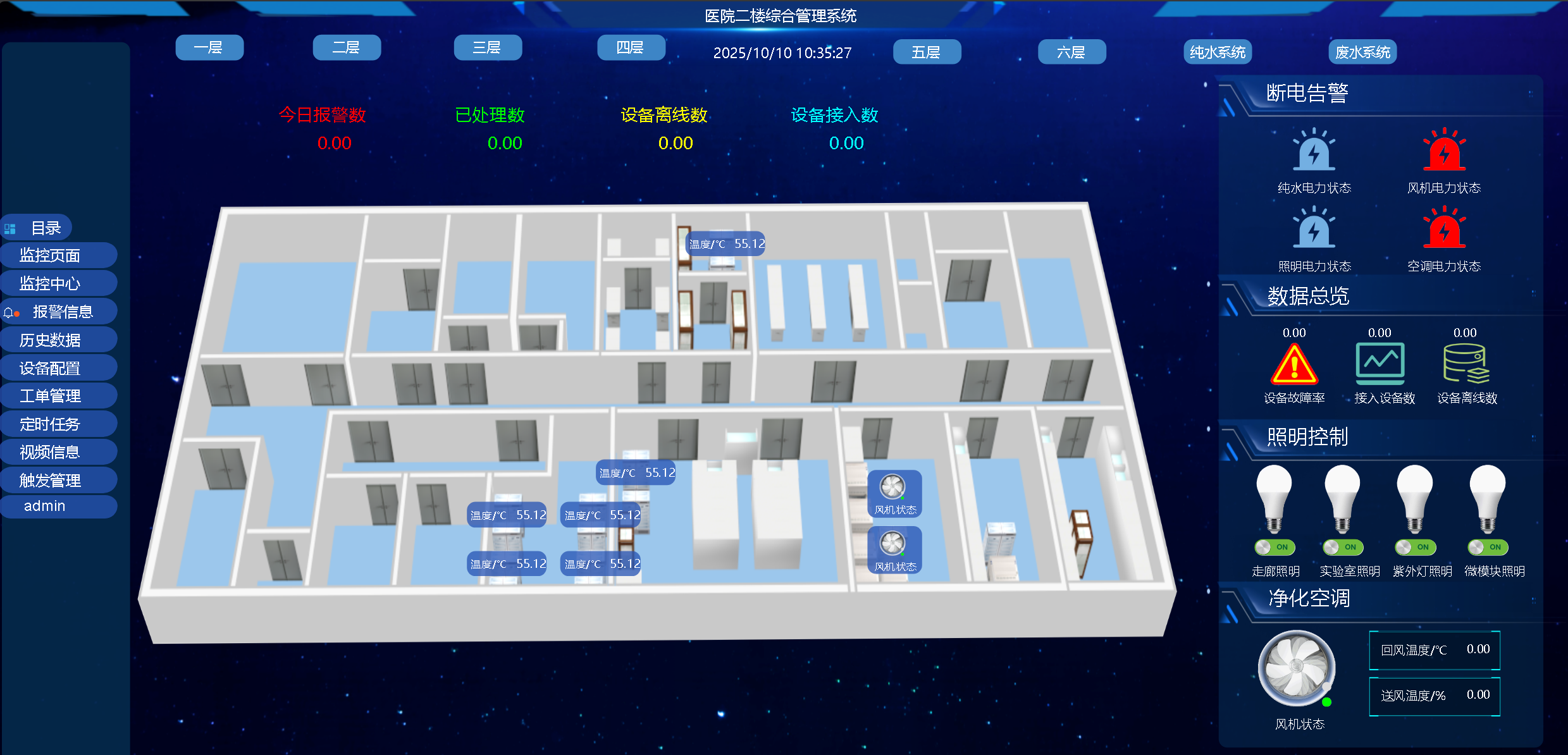 全局總覽:以醫院樓層平面圖為核心,動態展示各子系統關鍵狀態(如:溫濕度數值、設備在線/離線、告警點位閃爍)。